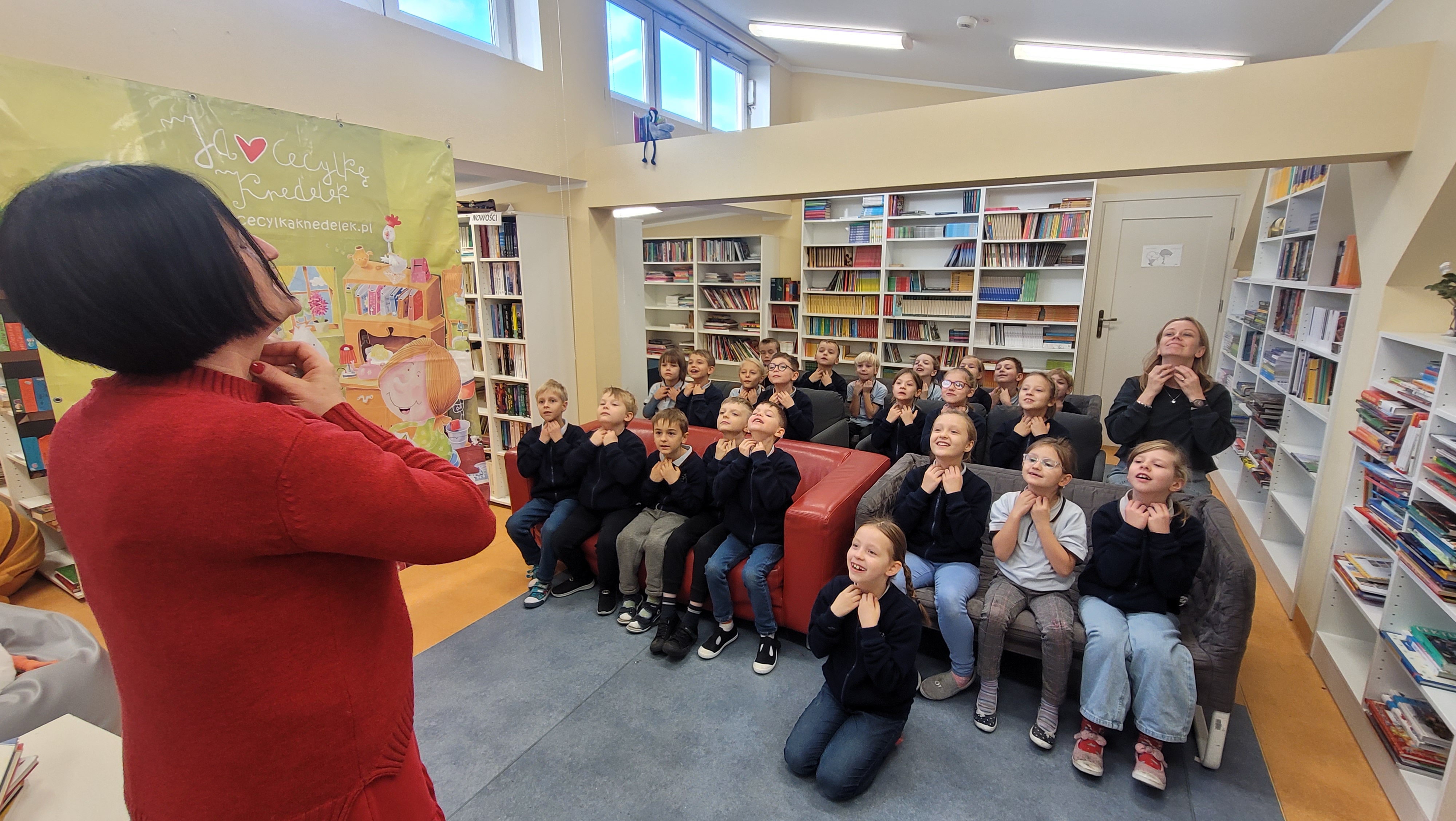 W tym roku mieliśmy niebywałe szczęście, bo z tej właśnie okazji odwiedziła naszą bibliotekę autorka książek dla dzieci - Joanna Krzyżanek, w towarzystwie Cecylki Knedelek i Gąski Walerii. Bohaterki książek p. Joanny opanowały bibliotekę. Gęś się szarogęsiła i tuląc się do każdego Pierwszaka, towarzyszyła Mu podczas pasowania na czytelnika naszej szkolnej biblioteki. Cecylka z uśmiechem czuwała nad uroczystością pilnując, by Jej łyżka, pożyczona bibliotekarce, dobrze wypasowała każdego zgłodniałego lektury czytelnika.