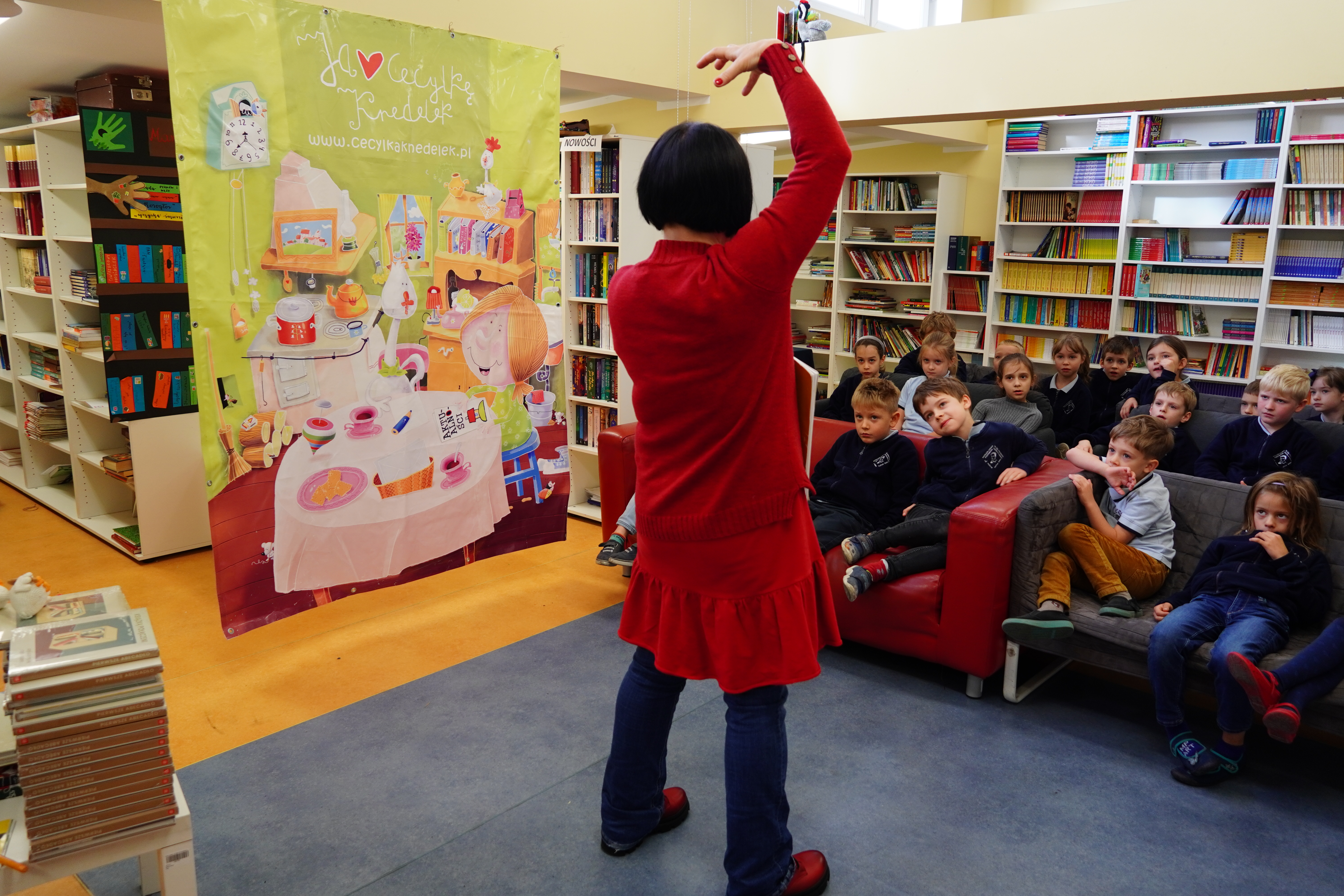 Pani Joanna opowiedziała nowym czytelnikom o swojej pierwszej napisanej książce i o swoich czytelniczych przygodach, ale też przeczytała kilka historii zawartych w swoich książkach. Było nam wszystkim bardzo miło i wesoło. Biblioteka bardzo lubi takich gości. Pani Joasia obiecała, że jeszcze nas kiedyś odwiedzi. Będziemy czekać z niecierpliwością i wypatrywać Jej z okien naszego poddasza. Póki co możemy czytać książki, które napisała, a których cała półka gości w naszej bibliotece.